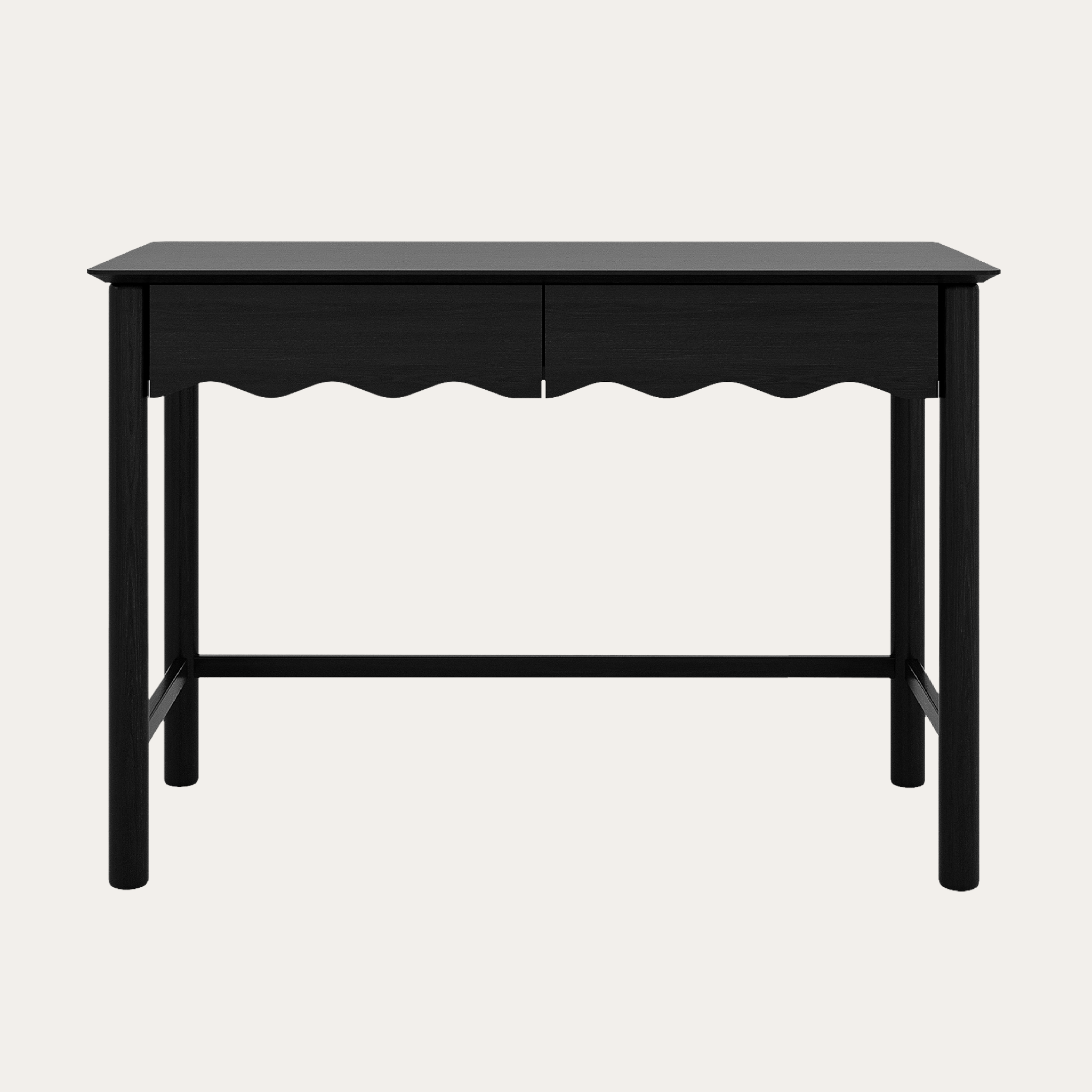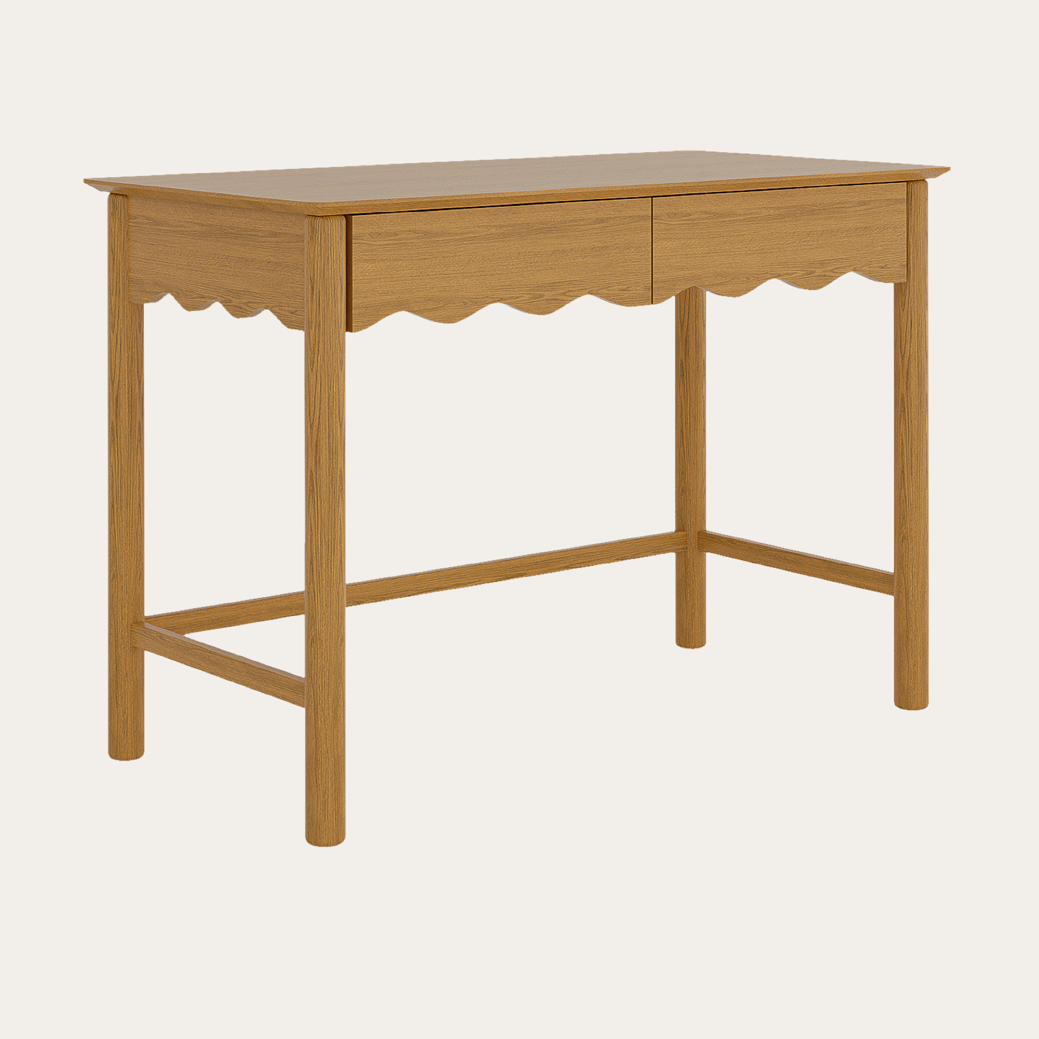 Bàn làm việc Calmo mang nét duyên dáng nhẹ nhàng với đường viền sóng lượn mềm mại, gợi cảm giác cổ điển đầy lãng mạn. Chất liệu gỗ tự nhiên ấm áp tạo sự thư thái trong từng khoảnh khắc sử dụng. Hai ngăn kéo kín đáo giúp sắp xếp gọn gàng, lý tưởng cho một góc làm việc hay trang điểm nhỏ xinh và đầy cảm hứng.