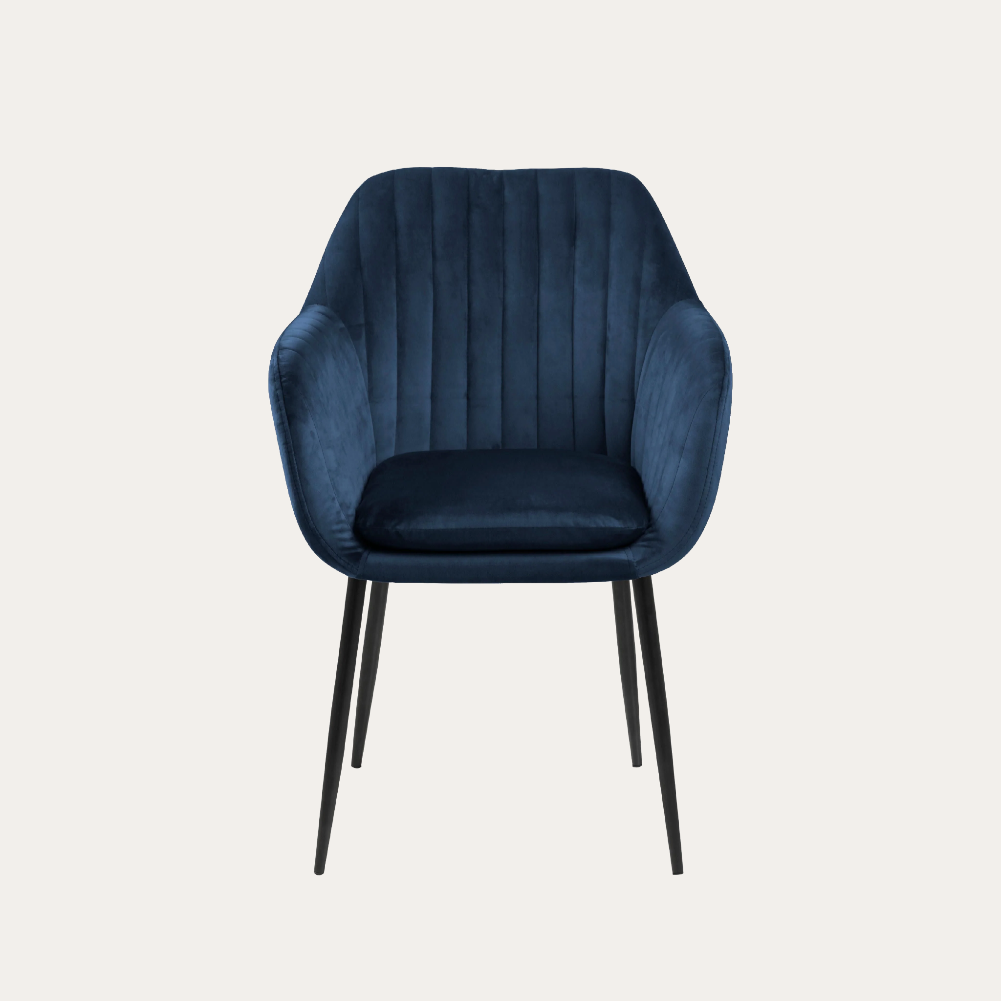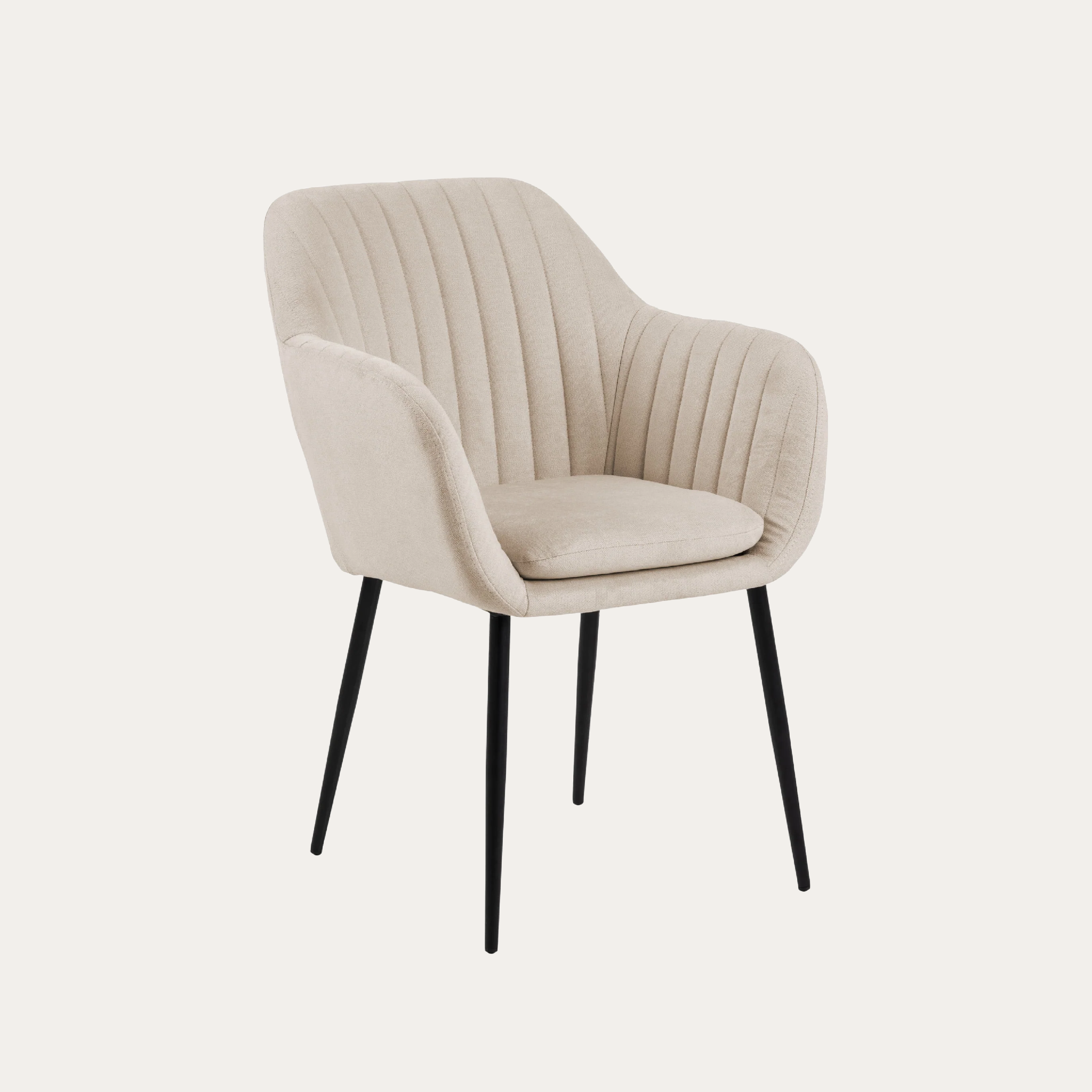 Ghế ăn Lara 1 – thiết kế có tay vịn ôm ấp, mang đến cảm giác thoải mái tuyệt đối cho mọi bữa ăn. Đệm ngồi nhung mềm mại với họa tiết chần sọc dọc tinh tế, chân sắt sơn đen tĩnh điện vững chắc tạo nên vẻ đẹp sang trọng hiện đại.