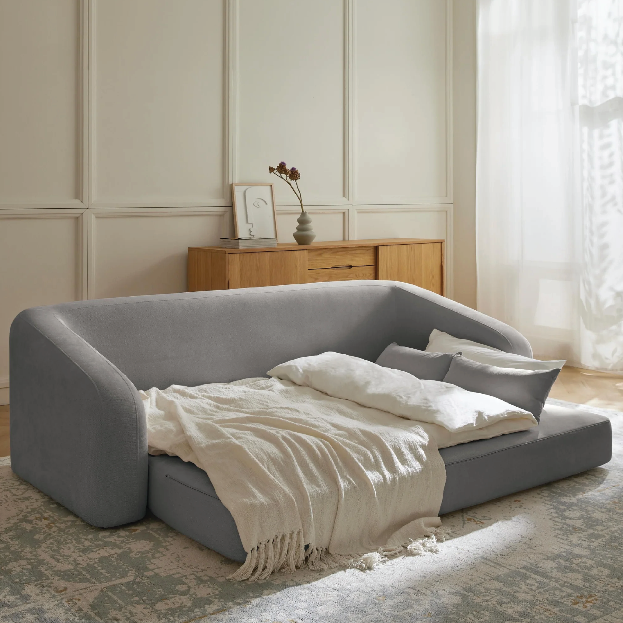 Mang đến phong cách tối giản, sang trọng và giúp không gian trở nên rộng rãi, sáng sủa hơn. Chất liệu vải bố chất lượng cao phù hợp với xu hướng nội thất hiện đại.