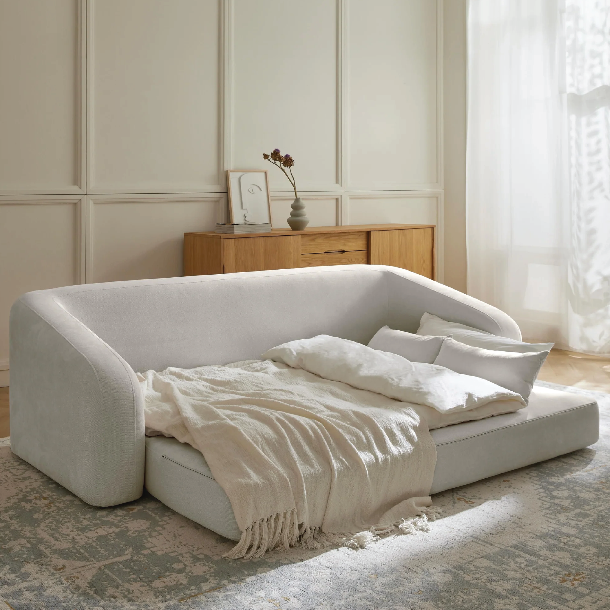 Cream là tông màu trung tính, mang vẻ đẹp tinh tế, nhẹ nhàng và sáng sủa giúp căn phòng trở nên thoáng đãng, thanh lịch và hiện đại. Cộng với chất liệu vải mềm mại, tạo cảm giác êm ái khi sử dụng.