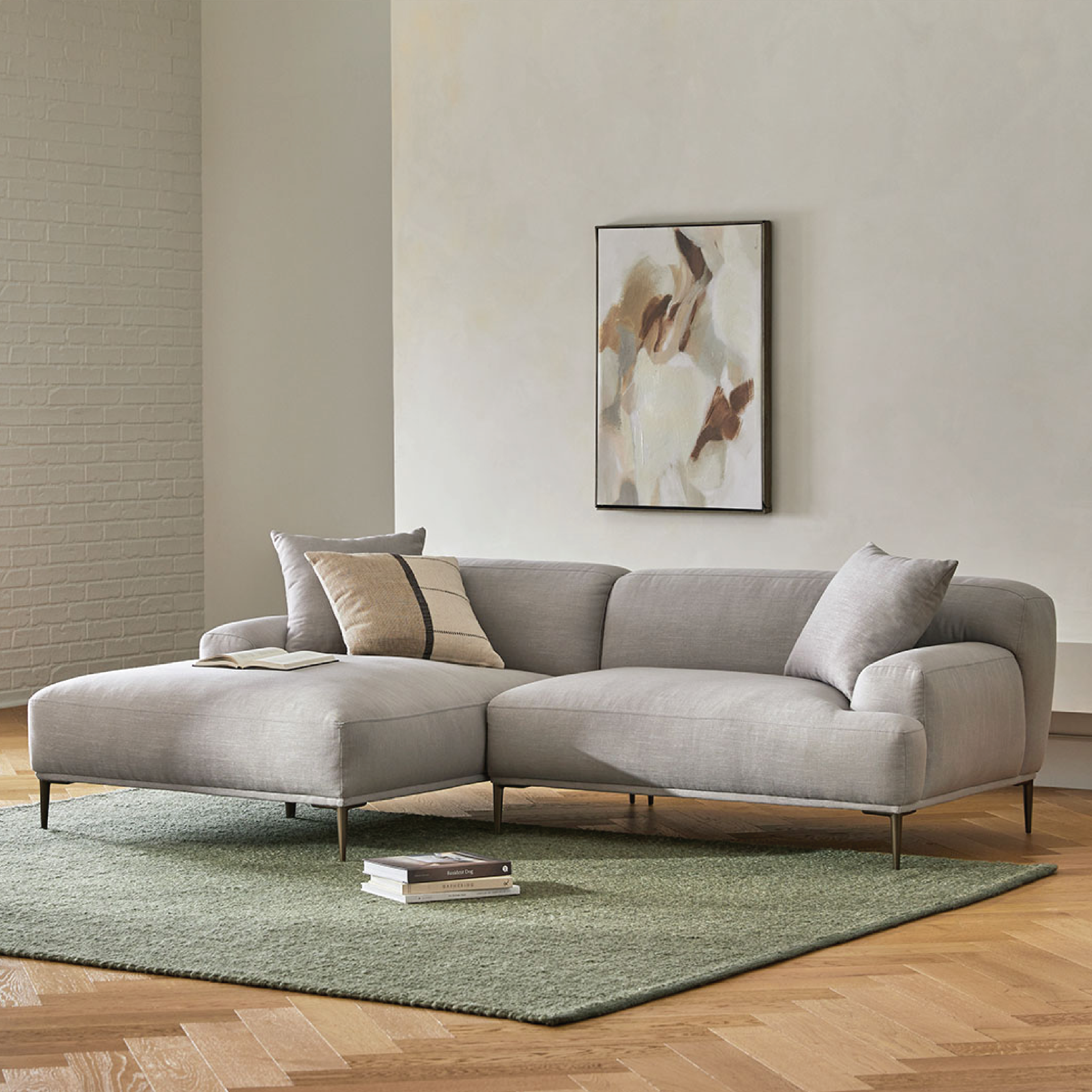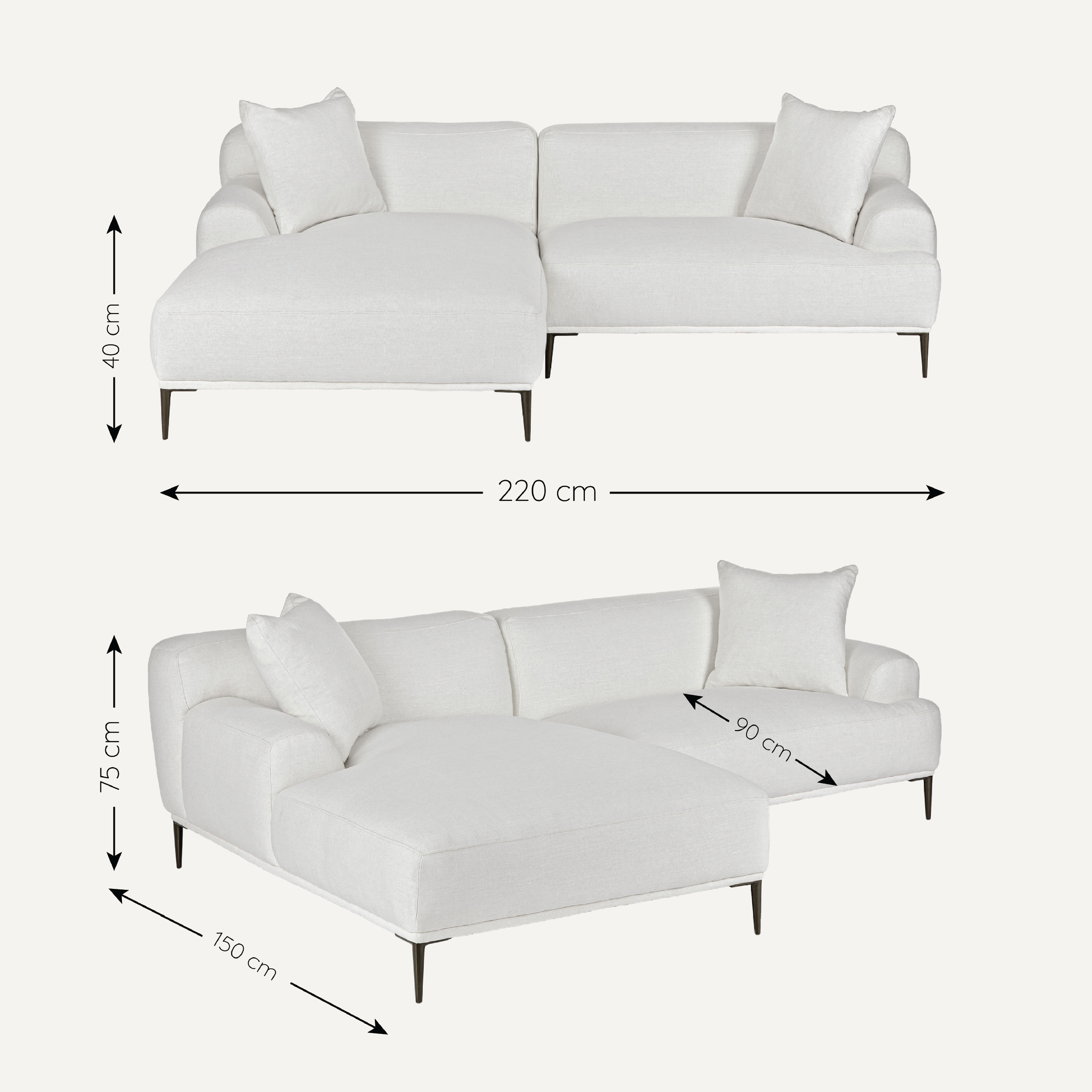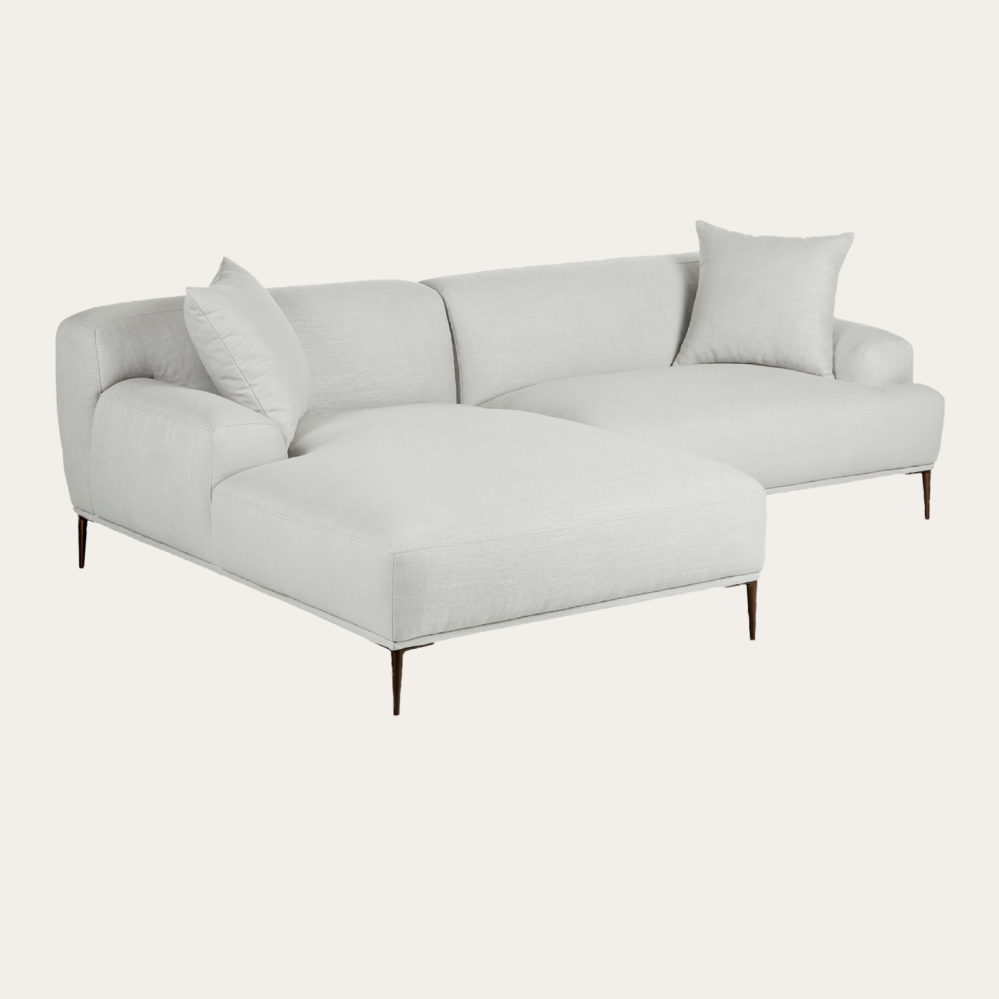 Sofa góc Emma – thiết kế hiện đại mở rộng không gian sống với đệm dày êm ái và gối tựa lớn, mang lại sự thoải mái trọn vẹn từ ngồi đến nằm. Tay vịn bo mềm mại, chân kim loại cao tạo dáng thanh thoát, sang trọng. Dễ dàng tùy chỉnh chất liệu và màu sắc, Emma là lựa chọn tinh tế cho mọi phong cách phòng khách.